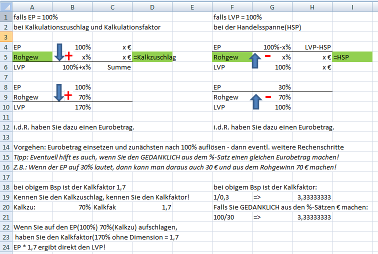 a)Der Kalkulationszuschlag sei 60,00%.Der Listenverkaufspreis beträgt 1.000,00 €. Berechnen Sie den Einstandspreis. b) Die Handelsspanne sei 45,00%. Der Einstandspreis sei 600,00 €. Berechnen Sie den Listenverkaufspreis. c)Der Kalkulationsfaktor sei 1,80. Der Listenverkaufspreis lautet 780,00 €. Berechnen Sie den Rohgewinn. d)Der Rohgewinn beträgt 320,00 €. Die Handelsspanne sei 40,00%. Berechnen Sie den Einstandspreis. e)Die Handelsspanne sei 29,00%. Berechnen Sie den Kalkulationsfaktor.